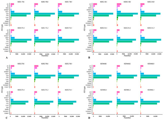 The predicted number of alternative splicing in Hanzhong Ma ducks during different growth stages. (A–D) represent the predicted number of alternative splicing in Hanzhong Ma ducks on day 17, 21, 27 of incubation, and postnatal 6-month-old, respectively.