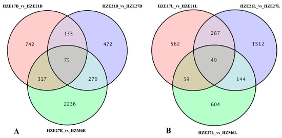 Venn diagram of DEGs among the three comparison groups. (A) The co-expressed DEGs in breast muscle of Hanzhong Ma ducks; (B) The co-expressed DEGs in leg muscle of Hanzhong Ma ducks.