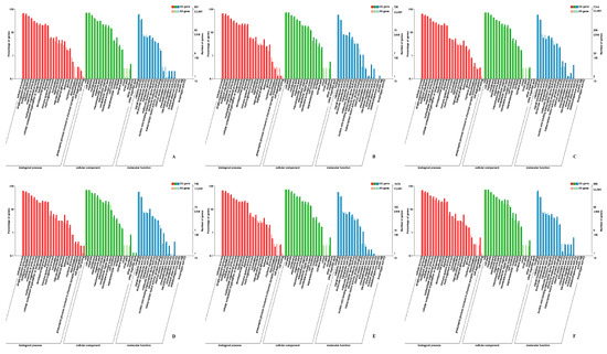 GO enrichment analysis of DEGs in Hanzhong Ma ducks. (A) HZE17B_vs_HZE21B; (B) HZE21B_vs_HZE27B; (C) HZE27B_vs_HZM6B; (D) HZE17L_vs_HZE21L; (E) HZE21L_vs_HZE27L; (F) HZE27L_vs_HZM6L. Note: The abscissa was GO terms, the ordinate on the left was the percentage of genes in all genes annotated with GO, right was the number of genes.
