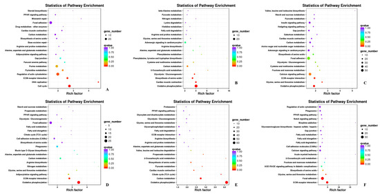 Annotation of DEGs in KEGG. (A) HZE17B_vs_HZE21B; (B) HZE21B_vs_HZE27B; (C) HZE27B_vs_HZM6B; (D) HZE17L_vs_PHZE21L; (E) HZE21L_vs_HZE27L; (F) HZE27L_vs_HZM6L. Note: In the figure, each circle represented a KEGG pathway, the name of which was shown on the left legend. Abscissa was enrichment factors, showing the proportion of (a) to (b), (a) was the ratio of differentially expressed genes in the pathway with all DEGs in all pathways; (b) was the ratio of genes in the pathway with all genes in all pathways. The bigger the Rich factor is, the more significant the pathway is. The color of the circle represented the q value which is the adjusted p-value by multiple hypothesis testing. Thus, the smaller the q value is, the more significant the pathway is; the circle size represented the number of differentially expressed genes annotated with the pathway, the bigger circle size is, the higher the number of genes.