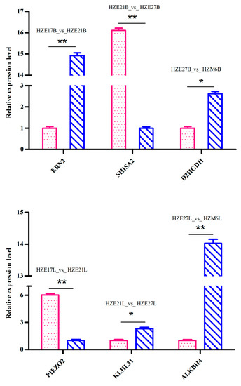 qPCR verification of DEGs. “*” was considered significant difference (p < 0.05); “**” was considered extremely significant difference (p < 0.01).