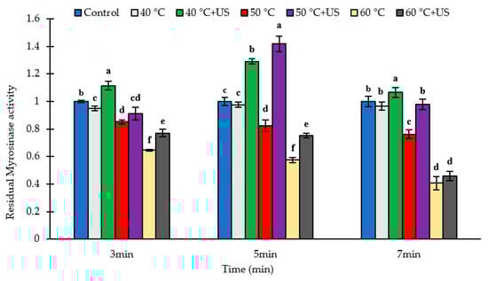 In contrast, thermosonication treatment at 40 °C for various times led to significant increases (p < 0.05) in myrosinase activity of 6.6–29.1% compared to untreated broccoli. The impact of thermosonication treatment at 50 °C was dependent on the treatment time; 5 min treatment resulted in a ~40% higher (p < 0.05) myrosinase activity compared to control whereas 3 min treatment resulted in a slight decrease in activity (p <0.05) with no difference in activity observed between the control and samples treated for 7 min (Figure 2). On the other hand, thermosonication treatments at 60 °C resulted in a slight but significant (p < 0.05) decrease in the activity of myrosinase compared to the untreated control for all treatment times. However, the level of activity decrease after thermosoncation at 60 °C was significantly lower (p < 0.05) than those observed for the corresponding thermal treatments at the same time/temperature condition except for the 7 min treatment. The residual myrosinase activity in samples thermosonicated at 60 °C for 7 min was 5.4% higher than the corresponding values for thermally treated samples at the same condition, although the difference was not statistically significant (p > 0.05).