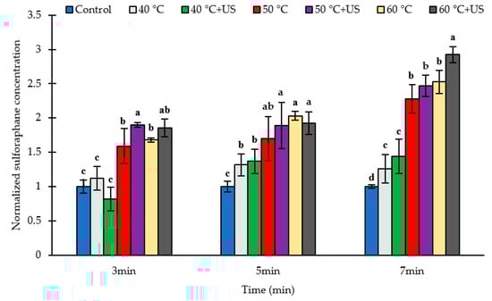 The effects of thermal treatment (40, 50, or 60 °C for 3, 5, or 7 min) and thermosonication (18 kHz) on the yield of the bioactive sulforaphane (SF) in broccoli puree after incubation for 2 h at 30 °C are presented in Figure 3 and Table S1 of the Supplementary Materials. The SF content in non-treated broccoli puree were on average 195.9 µg/g DW, 180.6 µg/g DW and 592.1 µg/g DW for batch 1, batch 2 and batch 3 samples respectively (Table S1 in Supplementary Materials). The higher level of sulforaphane in the untreated batch 3 samples could be due to the higher myrosinase activity in this sample (Section 3.1.). Heating alone for 3, 5, and 7 min at 40 °C increased SF by 12.9, 31.7, and 26.0% respectively, compared to raw broccoli, although the increase for 3 min treatment was not statistically significant (p > 0.05). Thermal treatment at 50 °C or 60 °C for 3, 5 or 7 min significantly increased (p < 0.05) SF yield when compared to untreated broccoli. The SF contents were 68.1–152.6% higher after treatment at 60 °C compared to the untreated control whereas the SF contents were 59 to 128% higher than control in the case of the 50 °C heat treatments. Nevertheless, the difference in the relative increase of sulforaphane content between 50 and 60 °C was not statistically significant (Figure 3). The maximum SF concentration among the studied conditions was achieved after 7 min heat treatment at 60 °C (Table S1). This may not represent the absolute maximum since increase in treatment time or temperature may result in a higher sulforaphane yield, although earlier studies [] indicate that longer treatments at 60 °C may result in substantial inactivation of myrosinase and hence lower sulforaphane yield.