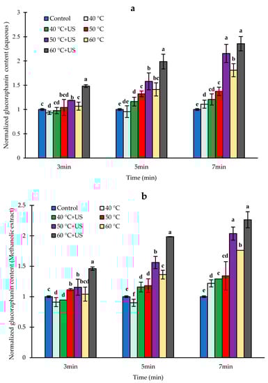 The normalized residual level of glucoraphanin contents (glucoraphanin content in treated samples/glucoraphanin content in untreated control) in aqueous (a) and methanolic (b) extracts from broccoli puree after thermal/thermosonication pre-treatments of broccoli florets and conversion to sulforaphane. Letters above each bar indicate the results of Duncan’s test; Different letters within the same group indicate significant difference (p < 0.05).