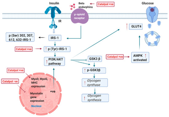 In STZ-induced T1DM rats, catalpol (0.1 mg/kg, i.v.) administration significantly controlled the glycemic parameters. These effects were correlated with an enhanced β-endorphins secretion from the isolated adrenal medulla of the rats [15]. β-endorphins is an endogenous opioid neuropeptide that exerts its effects such as analgesic when it binds to the opioid µ-receptors [22]. Evidently, other than analgesic effect, activation of opioid µ-receptor by β-endorphins also improved glucose homeostasis through the downregulation of PEPCK expression, which is a rate-limiting enzyme in gluconeogenesis [23]. Thus, catalpol suppresses gluconeogenesis through increased β-endorphins secretion and activation of opioid µ-receptors in STZ-diabetic rats [15]. Thereby, catalpol improved glucose uptake and glucose metabolism in the liver of diabetic state [13].