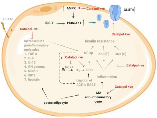Adipose tissues contribute to systemic inflammation by producing extensive varieties of adipokines, cytokines, and chemokines [51]. In obese individuals, the adipose tissue expansion is correlated to the accumulation of macrophages and other inflammatory cells such as mast cells or neutrophils [51]. Macrophage polarization is critical for inflammation and tissue homeostasis [52]. The macrophage can be polarized into two distinct forms, known as M1 or M2. M1 is the classically activated macrophage that promotes the secretion of M1-proinflammatory factors such as TNF-α, IL-6, IL-1β, MCP-1, iNOS, and CD11C to induce inflammation, whereas M2, the alternatively activated macrophage, induces high levels of anti-inflammatory factor such as arginase-1, Ym-1, IL-10, MGL1, Clec7a, and MMR to counter the inflammatory response [53]. In HFD induced T2DM mice, Zhou et al. demonstrated that the expression of M1-proinflammatory factors markedly increased and M2-anti-inflammatory factors were decreased in adipose tissue [11]. Evidently, the markedly upregulated M1 pro-inflammatory factor has been shown to prevent insulin action in insulin-responsive cells through autocrine and paracrine mechanisms [54]. On the contrary, catalpol (100 mg/kg, p.o., four weeks) significantly downregulated the M1-pro-inflammatory expression level and upregulated the M2- anti-inflammatory expression in HFD-diabetic mice, thereby decreasing insulin resistance through the suppression of inflammation [11]. Additionally, the p-JNK, p-IKκβ, and the activation of NF-κβ were significantly enhanced in the adipose tissue of HFD diabetic mice [11]. Many researchers have identified that the phosphorylated JNK negatively regulates the insulin signaling pathway and simultaneously leads to insulin resistance [55,56]. Additionally, IKκβ is a kinase that is involved in propagating the cellular inflammatory response through activation of NF-κβ, a family of transcription factors that stimulate the transcription of inflammatory genes [55,57]. Therefore, the inhibition of p-JNK, p-IKκβ, and NF-κβ could counteract insulin resistance in HFD-diabetic mice. In this regard, catalpol (100 mg/kg, p.o., four weeks) has been reported to suppress the p-JNK, p-IKκβ, and the activation of NF-κβ in the adipose tissue of HFD-diabetic mice. Collectively, these results imply that catalpol treatment could ameliorate insulin resistance in T2DM mice through attenuating the inflammatory protein signaling in the adipose tissues [11]. Oxidative stress and a high level of advanced glycation end products (AGEs) have been known as the key underlying cause of the development of DM and its complications [58]. AGEs are a diverse group of highly oxidant compounds that bind to their receptor (RAGE) to produce ROS and pro-inflammatory molecules [59]. Catalpol (500 µM) suppressed the ROS production in AGE-treated THP-1 cells, which mimic the situation of inflamed adipose tissue. Other than that, catalpol (500 µM) also downregulated the expression RAGE in AGE-treated THP-1 cells. Catalpol (500 µM) also inhibited NOX4 activity in THP-1 cells to prevent ROS formation. Overall, catalpol could inhibit oxidative stress through the suppression of AGE-induced ROS production and NOX4 activity [60]. Catalpol has been reported to elevate the plasma adiponectin level in db/db mice. Adiponectin released from adipose tissue exerts its action when it binds to its receptors (AdipoR1 or AdipoR2), and the function of adiponectin includes activating AMPK to increase glucose utilization [61]. Due to insulin resistance or inflammation, the serum adiponectin level was decreased in db/db mice, which were reversed by catalpol (80 or 160 mg/kg, p.o., four weeks) treatment [13].
