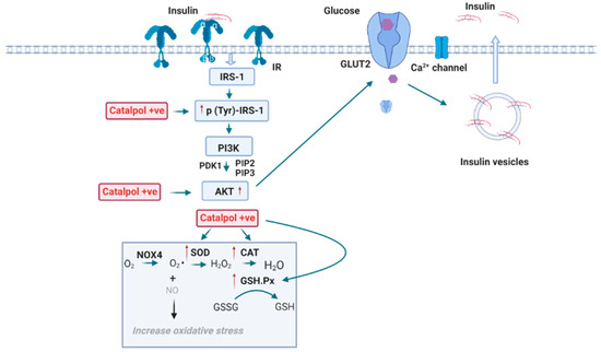 The autocrine action of insulin plays a remarkable role in β-cells function. Insulin controls its secretion and islet cell differentiation by positively regulating the insulin signaling cascade [62]. Recently, Elhassan et al. reported that p-IRS, PI3K, p-AKT, and AKT proteins in high glucose (HG) treated INS-1E pancreatic β-cells were downregulated. Thereby, the suppression of p-IRS, PI3K, p-AKT, and AKT proteins indicated that a HG environment has impaired the autocrine action of insulin. On the contrary, catalpol (30 mM) significantly increased the p-IRS, PI3K, p-AKT, and AKT proteins in HG-treated INS-1E cells. Thus, catalpol could ameliorate insulin sensitivity through the insulin-signaling pathway in β-cells [63,64]. Moreover, catalpol may act against T2DM-induced oxidative damage in pancreatic islet cells of HFD/STZ rats through antioxidant effects. Zhu et al. showed that the endogenous antioxidants such as SOD, GSH-Px, and CAT decreased, and the MDA levels increased, which indicates that oxidative stress was strengthened in HFD/STZ diabetic rats. Catalpol (50 mg/kg, i.v., two weeks) significantly improved SOD, GSH-Px, and CAT levels and reduced the MDA level in HFD/STZ diabetic rats. Therefore, catalpol could reduce oxidative stress by recovering the balance of endogenous oxidants and antioxidants [12]. In brief, catalpol improves the autocrine action of insulin through upregulating the IRS-PI3K-Akt signaling and attenuating oxidative stress in pancreatic β-cells (Figure 5). However, the effect of catalpol on the autocrine action of insulin could be further supported by in vivo studies.