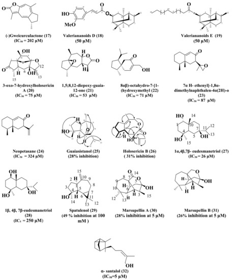 Yang et al. [87] reported the isolation of eremophilane sesquiterpenes from the Aquilaria sinensis (Lour.) Glig and elucidated their structures by the spectroscopic procedures. Isolated compounds were found out to be 7-β-H-9-(10)-ene-11,12-epoxy-8-oxoeremophilane (5) (48 ± 2% inhibition at 50 mg/mL with IC50 = 275 ± 5 µM); 7α-H-9(10)-ene-11,12-epoxy-8-oxoeremophilane (6) with 31 ± 1% inhibition at 50 mg/mL with IC50 = 491 ± 4 µM); neopetasane (7) (62 ± 1% inhibition at 50 mg/mL with IC50 = 158 ± 4 µM).