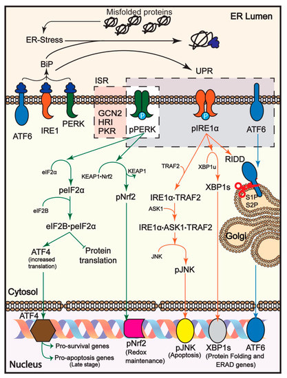 Protein misfolding, originated in gene mutations or in prion transmission, viral infection, DNA damage, reactive oxygen species (ROS) and other environmental and physiological factors, is responsible for induction of the cellular stress responses [7,8]. Proper protein folding, processing, localization and degradation are all crucial in maintaining protein homeostasis (proteostasis) within a cell. Disruption of proteostasis results in the activation of the cellular stress responses [9]. Accumulation of misfolded proteins in the ER results in ER stress and induction of the UPR, whereas the accumulation of misfolded proteins in the cytosol induces the Heat Shock Response (HSR) [10]. These stress responses are responsible for reducing the unfolded protein load by either halting protein synthesis, by increasing the expression of molecular chaperones to increase folding capacity or by upregulating the protein degradation machinery. The extent of ER stress and the ability to compensate it results in a selective role of the UPR, either pro-adaptive or pro-apoptotic. In case of failure in bringing the cell to homeostasis by the above methods, the UPR triggers initiation of programmed cell death or apoptosis [11,12].
