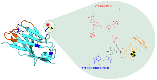 - Massa, S.; Xavier, C.; De Vos, J.; Caveliers, V.; Lahoutte, T.; Muyldermans, S.; Devoogdt, N. Site-Specific Labeling of Cysteine-Tagged Camelid Single-Domain Antibody-Fragments for Use in Molecular Imaging. Bioconjugate Chem. 2014, 25, 979–988. [Google Scholar] [CrossRef] [PubMed]