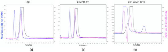 MSAP.2Rs15d could be successfully 111In-labeled, yielding a radiochemical purity of >95% as determined by iTLC. Further quality controls (QC) performed by radio-SEC, confirmed that the radioactive signal matched the retention times of MSAP.2Rs15d (absorbance at 280 and 650 nm) (Figure 2a), and that the tracer remained stable up to at least 24 h incubation in PBS or serum as no degradation of the protein, fluorescent, and/or radioactive signal was seen (Figure 2b,c)