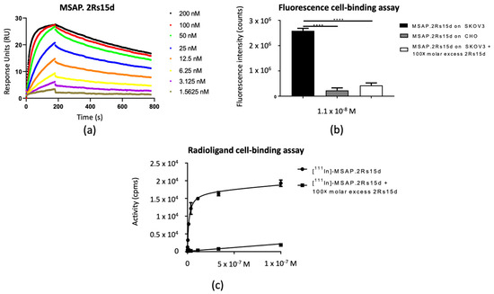 In vitro functionality assays. (a) SPR graphs of MSAP.2Rs15d on the immobilized HER2-Fc protein. (b) Fluorescence cell-binding assay of MSAP.2Rs15d at a fixed concentration of 1.1 × 10-8 M on HER2-expressing SKOV3 cells or HER2-negative CHO cells (**** p < 0.001). Data are represented as mean ± SD (n = 3 replicates per condition). (c) Saturation cell-binding assay (radioactive) demonstrating the specificity and high affinity of the [111In]In-MSAP.2Rs15d for the HER2-expressing SKOV3 cells. Data are represented as mean ± SD (n = 3 replicates per condition).