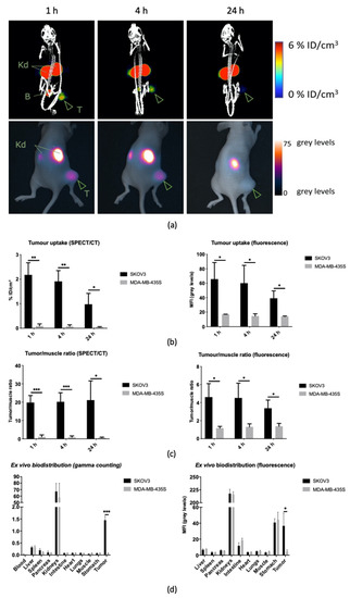 Of [111In]In-MSAP.2Rs15d 7.5 µg (12.3 ± 0.5 MBq, corresponding to 1 nmol MSAP, and apparent molar specific activity of 13.5 ± 0.6 GBq/µmol) was injected via the tail vein of either SKOV3 or MDA-MB-435S xenograft bearing mice. Consecutive single photon emission computed tomography/computed tomography (SPECT/CT) scans were performed at 1, 4, and 24 h post-injection, and after each scan, the same animal was subjected to fluorescence imaging. After the final timepoint, animals were killed by cervical dislocation for further ex vivo biodistribution studies. Fluorescence imaging of individual organs and tissues was performed, whereafter the organs and tissues were weighed, and their radioactive signal measured using a gamma counter (Wizard2 2480, Perkin Elmer). Results were decay-corrected and expressed as percentage of injected dose per cm3 (%ID/cm3).