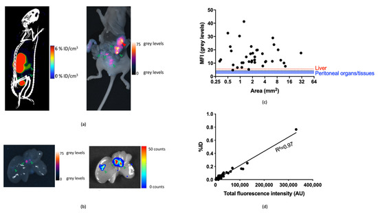 SPECT/CT scans (1 h post-injection) could be used to visualize the largest tumor masses (Figure 5a), however, smaller tumor nodules could not be visualized because of the inherent limited resolution and sensitivity of the imaging technique and shine through of the nearby kidneys. Subsequent opening of the abdominal cavity allowed in situ fluorescence-based visualization and fluorescence-guided removal of even submillimeter tumor lesions that were spread at the surface of the animal’s peritoneum (38 lesions were removed in total, Figure 5a–c). Ex vivo analysis of BLI-confirmed tumor lesions was then used to correlate the uptake of fluorescence and radioactive signals in the resected lesions. The %ID of radioactivity in resected tumor lesions was plotted against their total fluorescence signal (Figure 5d), and after fitting a line with linear regression, an R2 value of 0.97 was obtained, which indicates the good correlation between both modalities. The biodistribution and tumor-to-organ ratio’s obtained through ex vivo fluorescence imaging and gamma counting is displayed in Figure S3 and Table S3.