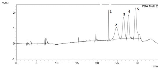 A fraction of the sum of flavonoids from in vitro callus, suspension cells, and root cultures of Rhodiola rosea was isolated by HPLC. The total content of the sum of flavonoids was 2.32% from the sample weight of in vitro callus, cell suspension, and root cultures (Figure 1). The results of the qualitative composition analysis of the dried biomass extracts of in vitro callus, cell suspension, and root cultures showed that the main biologically active substances in the medicinal plant, Rhodiola rosea, are 6-C-[1-(4-hydroxyphenyl)ethyl]aromadendrin (25 mg, yield 0.21%), 2-(3,7-dihydroxy-2-(2-hydroxypropan-2-yl)-2,3-dihydrobenzofuran-5-yl)-6,7-dihydroxychroman-4-one (23 mg, yield 0.2%), 2-(3,4-dimethoxyphenyl)-5,7-dimethoxychroman-4-one (175 mg, yield 1.5%), 5,7-dihydroxy-2-(4-hydroxy-3-(2-(4-hydroxyphenyl)-4-oxo-4H-chromen-6-yl)phenyl)-4H-chromen-4-one (45 mg, yield 0.5%), and 5,6,7,8-tetrahydroxy-4-methoxyflavone (0.35 mg, 0.5%).