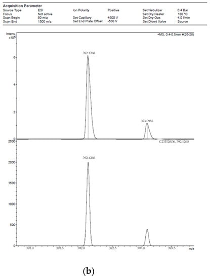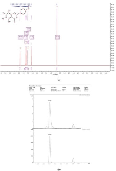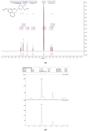 1H NMR (a) nd HRMS (b) spectrum of 2-(3,4-dimethoxyphenyl)-5,7-dimethoxychroman-4-one from extracts of callus, cell suspension, and root cultures of Rhodiola rosea.