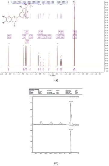 1H NMR (a) and HRMS (b) spectrum of 2-(3,7-dihydroxy-2-(2-hydroxypropan-2-yl)-2,3-dihydrobenzofuran-5-yl)-6,7-dihydroxychroman-4-one from extracts of callus, cell suspension, and root cultures of Rhodiola rosea.