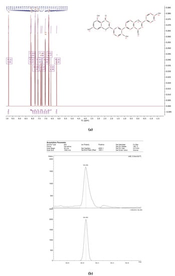 1H NMR (a) and HRMS (b) spectrum of 5,7-dihydroxy-2-(4-hydroxy-3-(2-(4-hydroxyphenyl)-4-oxo-4H-chromen-6-yl)phenyl)-4H-chromen-4-one from extracts of callus, cell suspension, and root cultures of Rhodiola rosea.