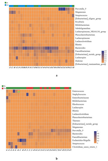 Distribution of microbial community for alcohol consumption group (Yes) vs. without alcohol consumption group (No) at genus level were visualized by community heatmap (≥ 1% relative abundance). The abundance of different samples reflects through color changes: (a) indicates maternal gut microbiota composition; (b) indicates newborns’ gut microbiota composition.