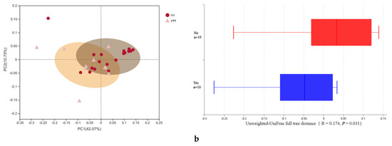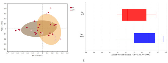 A significant difference in α-diversity was found between alcohol consumption and without alcohol consumption groups in mothers (p = 0.02) and in infants (p = 0.03). Mothers with alcohol consumption showed a higher diversity compared with those without alcohol consumption during pregnancy, and similar results had been identified in newborns (Table 1). The β-diversity through PCoA shows that the bacterial structure was separated based on maternal alcohol consumption (Abund–Jaccard, r = 0.2, p = 0.006) (Figure 2a). For newborns, the first two principal component scores, accounting for 52.82% of the total variations (unweighted-UniFrac full tree, r = 0.174, p = 0.031) suggested that alcohol consumption was one of the important factors in the change of microbiota composition structure (Figure 2b).