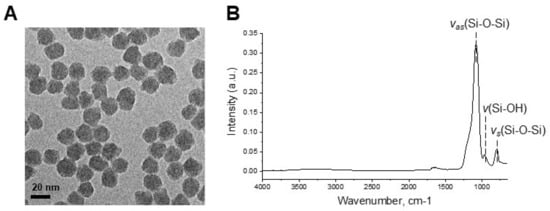 (A) Transmission electron microscopic image and (B) FT-IR spectrum of 20 nm SiO2 NPs before culturing with HepG2 cells.