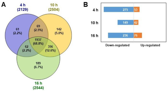 Label-free quantification (LFQ)-based proteomic analysis of HepG2 cells in comparison with controls and SiO2 NP groups at each time point (4, 10, and 16 h). (A) Venn diagram of the quantified proteins after the treatment of SiO2 NPs for 4, 10, and 16 h. (B) Upregulated and downregulated proteins in HepG2 cells exposed to SiO2 NPs after 4, 10, and 16 h compared to their control groups.