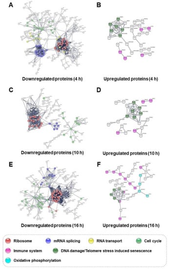 We confirmed the trend in cellular response over time through the Venn diagram analysis (Figure 3A). To assess the changes according to time in more detail, proteins which were upregulated and downregulated were extracted from each SiO2 NP group compared to each control group (Figure 3B). According to the SiO2 NP-treated group and the control group for the 4 h comparison result, 275 downregulated and 53 upregulated proteins were observed. In HepG2 cells, 149 downregulated and 42 upregulated proteins were detected as the SiO2 NPs treatment time elapsed for 10 h, but the number of the differentially expressed proteins over exposure of SiO2 NPs after 16 h were increased (236 downregulated and 76 upregulated proteins). We attempted to analyze the time course of cytotoxicity by constructing a protein–protein interaction network using the STRING algorithm for differently expressed proteins between time groups. Following 4 h of exposure to SiO2 NPs, downregulated proteins were related to the ribosome, mRNA splicing, RNA transport, and the cell cycle (Figure 4A). Some of these proteins which were involved in ribosomes, mRNA splicing, and cell cycle were shown to be continuously downregulated even in the 10 h (Figure 4C) and 16 h SiO2 NP groups (Figure 4E). The 53 proteins upregulated in the 4 h group were associated with immune system and DNA damage/telomeres stress-induced aging (Figure 4B), and the same interaction was found at 10 h (Figure 4D). In the 16 h SiO2 NP group, upregulated proteins involved in the immune system and DNA damage/telomere stress-induced senescence were found to be increased, and proteins related to oxidative phosphorylation were detected (Figure 4F). In previous studies, it has been reported that oxidative phosphorylation proteins were upregulated under the influence of ROS generated from SiO2 NPs [39,40,41]. To determine whether these proteins were indeed affected by ROS production in our system, H2-DCF-DA staining was performed to measure ROS levels in HepG2 cells in accordance with the elapsed time after exposure to SiO2 NPs. There was no significant change even after exposure to SiO2 NPs for 4 h compared to the 0 h control group; however, after 10 h, it was confirmed that the ROS level significantly increased with elapsed time (Figure S1). Based on these results, we demonstrated that ROS produced by SiO2 NP-induced cellular responses in HepG2 cells such as oxidative phosphorylation and immune system. Detailed information for down- and upregulated proteins involved in specific interactions as indicated in Figure 4 is described in Tables S2 and S3, respectively.