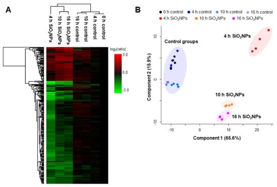 (A) Heatmap (with hierarchical cluster analysis) and (B) principal component analysis of the differentially expressed proteins from SiO2 NPs-treated HepG2 cells in increase of exposure time in comparison to the 0 h group. The filled circles of the same color represent four duplicates.