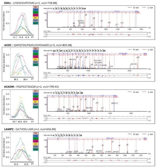 We also investigated the major cellular pathways associated with the proteins observed to have been upregulated, as listed in Table 3. Among the upregulated proteins, endosome-related proteins, including anthrax toxin receptor 1 (ANTR1), thioredoxin domain-containing protein 5 (TXND5), and CD81 antigen (CD81), were significantly upregulated 4 h after exposure to SiO2 NPs, and continued to be upregulated up to 16 h. Proteins associated with the phagosome, such as HLA class I histocompatibility antigen A alpha chain (HLAA), integrin beta-1 (ITB1), and V-type proton STPase subunit d1 (VA0D1), were upregulated in the 10 h SiO2 NP group; most of these were upregulated to a greater extent with increasing exposure time to SiO2 NPs. When extrinsic substances are introduced into cells by endosomes and phagosomes, the production of lysosomes is activated to decompose these substances. Thus, it can be seen that some of the proteins associated with the lysosome, such as dolichyl-diphosphooligosaccharide-protein glycosyltransferase 48 kDa subunit (OST48), lysosome-associated membrane glycoprotein 2 (LAMP2), and prenylcysteine oxidase 1 (PCYOX), were upregulated in the 4 h SiO2 NP group, and most of the proteins were significantly upregulated in the 10 h SiO2 NP group. Since endosomes and phagosomes continue to form until an elapsed time of 16 h, it was observed that proteins related to lysosomes were significantly upregulated even in the 16 h SiO2 NP group. Unlike carbon metabolism, most proteins involved in lipid metabolism, including lysophospholipid acyltransferase 7 (MBOA7), sphingolipid delta(4)-desaturase DES1 (DEGS1), and medium-chain specific acyl-CoA dehydrogenase (ACADM), were significantly upregulated in the 10 and 16 h SiO2 NP groups. Some proteins are upregulated in the control without SiO2 NP, but since these proteins are further upregulated in the presence of SiO2 NP, it was confirmed that several intracellular pathways are affected by SiO2 NP. In Figure 6, MS and tandem MS spectra for four representative proteins involved in the biological pathways are shown. The representative downregulated [CDK1 (LESEEEGVSTAIR) and ACOC (QAPQTIHLPSGEILDVFDAAER)] and upregulated proteins [ACADM (IYQIYEGTSQIQR) and LAMP2 (GILTVDELLAIR)] were also found.