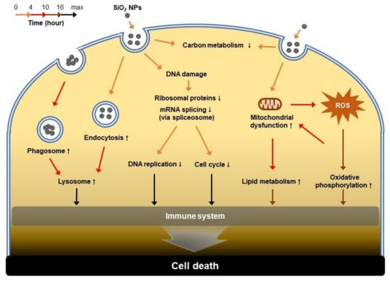 Previous studies have reported mitochondrial damage caused by nanoparticles or ROS as a major cause of SiO2 NPs cytotoxicity [40,41,44,48]. In our results, we confirmed that mitochondria-related proteins were significantly downregulated in the 4 h SiO2 NP group. These results suggest that the factor inducing mitochondrial damage in HepG2 cells is SiO2 NPs itself. The nanoparticles introduced into the cells activated the immune system from the beginning of the introduction and caused DNA damage, in which the tendency remained the same even in the 10 h groups. After 16 h of exposure to SiO2 NPs, oxygen molecules produced by ROS activate oxidative phosphorylation by upregulating cytochrome b-c1 complex subunit Rieske (UQCRFS1), cytochrome c oxidase subunit 2 (MT-CO2), NADH-ubiquinone oxidoreductase chain 4 (MT-ND4), and succinate dehydrogenase cytochrome b560 subunit (SDHC). Furthermore, the proteins involved in lipid metabolism such as DEGS1, MBOA7, and ACADM were also upregulated in the 10 and 16 h groups. Duan et al. confirmed that the proteins involved in hepatic lipid metabolism were upregulated when exposed to SiO2 NPs; these results are consistent with our results [21]. In contrast, the carbon metabolism-related proteins, which regulate energy production, were downregulated in the 4 h group. Lee et al. demonstrated that exposure to SiO2 NPs in human embryonic kidney 293 (HEK293) cells resulted in disorders of glucose metabolism as well as glucose uptake [58,59]. Gradually, as the exposure time of SiO2 NPs increases, cellular responses such as lipid metabolism and oxidative phosphorylation increase, and lead to the activation of the immune system. The analysis of intracellular changes in HepG2 that occurred 16 h after exposure to SiO2 NPs allowed a closer look at the mechanisms of early cytotoxicity. When SiO2 NPs are exposed to cells for longer periods, the cells eventually die through a cytotoxic pathway, such as autophagy [60,61], apoptosis [9,62,63], lysosome-induced cell death [47,50], and necrosis [10,30,64] (Figure 7). Although this study focused on global changes in the early stages of nanoparticle exposure, we expect that proteomic analysis following a future separate organelle-based study will enable a deeper understanding of the molecular processes underlying their cytotoxicity and eventuating in SiO2 NP-induced cell death. Additionally, the complementary research with a biological assay will provide a more detailed mechanism and biological pathway at a specific time point.