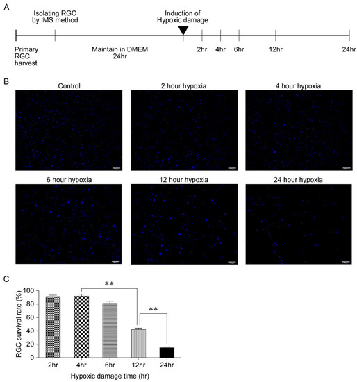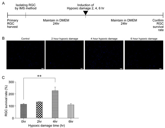 Consequence of varying durations of exposure to hypoxic conditions in primary retinal ganglion cells (RGCs). (A) After harvesting primary RGCs from the postnasal rat retinas, the cells were maintained for 24 h in a defined medium; then, hypoxic damage was inflicted on the cells in a CO2 chamber. After exposure to hypoxic conditions for 2, 4, 6, 12, and 24 h, the cells in each sample were counted. (B) Representative images of RGCs after exposure to hypoxic conditions for 2, 4, 6, 12, and 24 h. Scale bar, 100 µm. (C) Number of RGCs after exposure to hypoxic conditions for 2, 4, 6, 12, and 24 h. Data in the columns indicate the mean survival rate ± SD. Differences in RGC survival rates are indicated (** p < 0.01).
