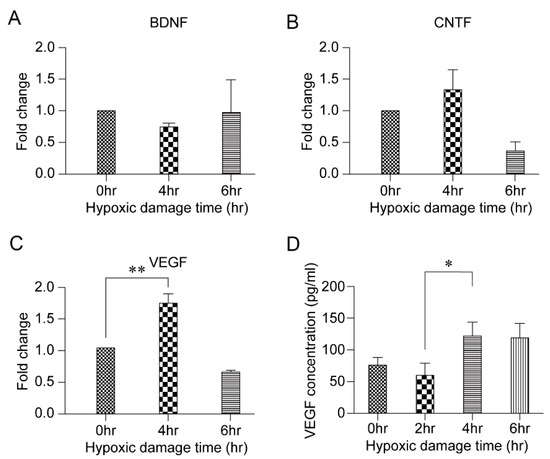 Vascular endothelial growth factor (VEGF) and hypoxic damage. (A–C). Fold changes in the expression of brain-derived neurotrophic factor (BDNF), ciliary neurotrophic factor (CNTF), and VEGF after hypoxic preconditioning of retinal ganglion cells (RGCs) for 4 and 6 h. Data in the columns indicate the mean fold changes ± SD. (D) VEGF concentration after hypoxic preconditioning of RGCs for varying lengths of time (2, 4, and 6 h). Data in the columns indicate the mean concentrations ± SD. Statistically significant differences in the mRNA fold change and VEGF concentration are indicated (* p < 0.05 and ** p < 0.01).