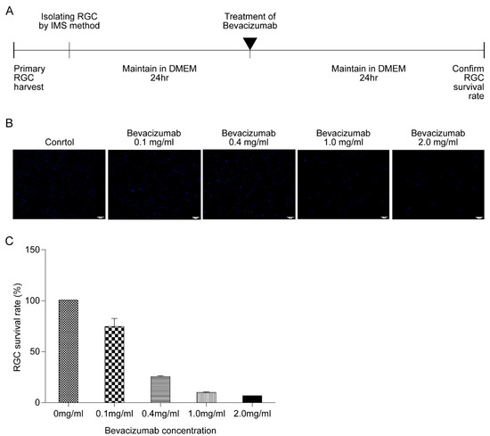 Retinal ganglion cell (RGC) survival rate according to antivascular endothelial growth factor (VEGF) antibody concentration. (A) After treatment with different concentrations of bevacizumab (0.1, 0.4, 1.0, and 2.0 mg/mL), RGCs were maintained in a defined medium for 24 h, and cell survival rates were compared. (B,C) Representative images and number of RGCs after bevacizumab treatment (0.1, 0.4, 1.0, and 2.0 mg/mL). Scale bar, 100 µm.