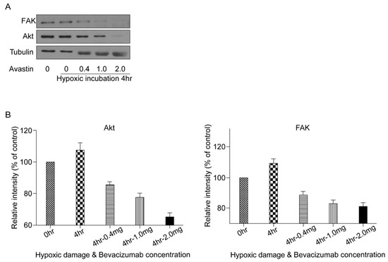 Hypoxic preconditioning and the vascular endothelial growth factor (VEGF) survival pathway. (A) Signaling molecules involved in pathways downstream of VEGF activation were investigated using immunoblot assays. Akt and focal adhesion kinase (FAK) levels were compared between the 4-h hypoxic preconditioning group and groups in which bevacizumab (0.4, 1.0, and 2.0 mg/mL) was administered. Representative gel images are shown. (B) Densitometry of Akt and FAK immunoblots. Data in the columns indicate the mean density ± SD, normalized to the level of tubulin in the same sample.