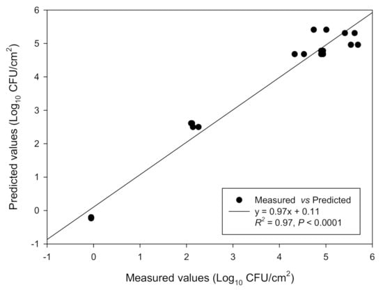 Indeed, a satisfactory linear relationship was recorded between the measured and predicted data for the concentrations of the attached-to-SS coupons populations (Log10 CFU/cm2) of the four-strain L. monocytogenes cocktail (Figure 1).