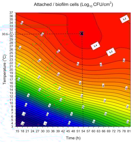The alterations in the concentration of sessile cells (Log10 CFU/cm2) as a function of the concurrent change of each possible pair of the two factors evaluated (i.e., time and temperature) are presented in the form of a contour plot in Figure 2. It is clear that the concentration of the attached/biofilm cells tends to be maximized (>5.4 Log10 CFU/cm2) at temperatures above 26 °C combined with incubation time ranging from approximately 45 h to 65 h. At the same time, the further increase of incubation temperature (>26 °C) seems to decrease the time needed for the cells to maximize their accumulation onto the surfaces. For instance, at 37 °C, attached cells surpass the density of 5.4 Log10 CFU/cm2 as early as 30 h of incubation. However, at this high temperature, the sessile population seems to slightly decrease earlier as incubation time passes (i.e., <5.4 Log10 CFU/cm2 from 60 h and more). This is probably due to detachment phenomena.