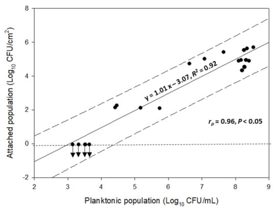 Correlation between the concentrations of the measured planktonic (Log10 CFU/mL) and attached populations to the SS coupons (Log10 CFU/cm2) of the four-strain L. monocytogenes cocktail. The solid line represents the linear regression equation, while the dashed parallel lines represent the prediction intervals (α = 0.95). The mathematical equation of the linear regression, together with its regression coefficient (R2), Pearson correlation coefficient (rp), and p-value are also presented. Dots represent the mean values of all experiments included in the CCRD (n = 20; i.e., those shown in Table 1). For more clarity, the bars of standard deviations have been omitted. The horizontal dotted line illustrates the detection limit of the plate counting method of the sessile cells (i.e., −0.05 Log10 CFU/cm2).