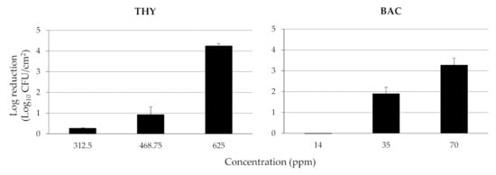 The log reductions of attached/biofilm population on SS coupons of the four-strain L. monocytogenes cocktail (5.46 ± 0.31 Log10 CFU/cm2), following the 15 min disinfection exposure to each chemical (i.e., THY, BAC) being applied at three different concentrations (ppm), are presented in Figure 4. As expected, log reductions increased as the chemicals’ concentrations increased, meaning that more bacteria died upon increasing the chemical’s concentration. More importantly, the results revealed the significant disinfection efficiency of THY, with a concentration of 625 ppm (= 4 × MBC), leading to almost undetectable (<0.95 Log10 CFU/cm2) viable bacteria (i.e., more than 4 logs reduction; 99.99% killing rate). On the other hand, the reduction did not exceed 3.5 logs even when BAC was applied at 23.3 times more than its MBC (i.e., 70 ppm).