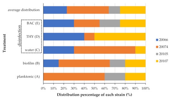 The contribution of each strain in the composition of the mixed planktonic population, which existed at the end of incubation (i.e., for 54 h at 30.6 °C) in the dLB in which the SS coupons had been placed as substrata for the bacterial attachment, in addition to that encountered in the mixed sessile communities found on the surfaces, both before and after their disinfection (i.e., 15-min exposure to water as control, 468.8 ppm THY, or 35 ppm BAC), are depicted in Figure 6. In general, the different strains were found to behave differently regarding their either planktonic or sessile growth and their disinfection resistance; the latter also found to be affected by the applied disinfectant. Thus, for instance, strain AAL20066 was not at all detected in the planktonic population (treatment A), whereas this strain still represented the 15% of the isolates (colonies) recovered from those plates used to quantify the attached/biofilm population (treatment B). As another example of this variability, this time on resistance, strain AAL20105 was not at all detected following disinfection with either water (control) or THY (468.8 ppm) (treatments C and D, respectively), whereas the 20% of colonies appearing on the plates following disinfection with BAC (70 ppm) belonged to that strain (treatment E). That heterogeneity in the behavior of each strain is also evident when someone considers the average overall distribution of each one in which, for instance, strain AAL20074 presented an appearance rate of 41%, whereas strain AAL20105 appeared approximately four times less exhibiting an average overall distribution equal to 11%.