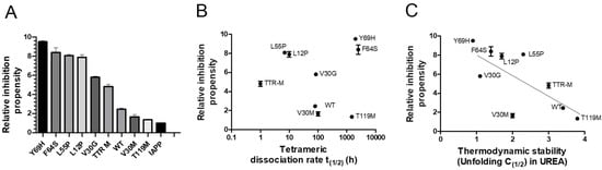 3.1. Evaluating the Inhibiting Propensity of TTR as a Function of Its Intrinsic Stability