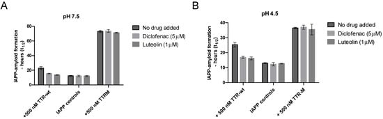 4.3. TTR Prevents IAPP Amyloid Formation at Low pH but the Effect Is Impaired by Stabilizing Ligands