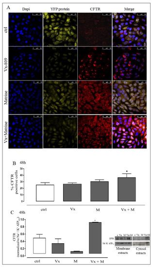 3.1. Vx-809 and Matrine Co-Treatment Increases CFTR Localization in Membrane