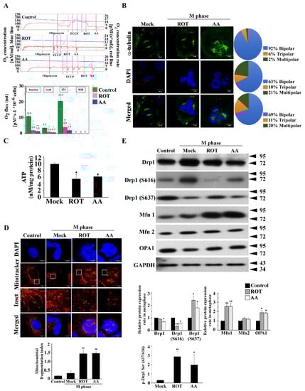 Inhibition of mitochondrial ETC complexes I and III induces multiple spindles formation. (A) HeLa cells lost almost all respiratory capacity after ROT or AA treatment. The OCR was determined in the presence of ROT (200 nM), AA (10 μM) and control at 24 h using an oxygen electrode (Ouroboros O2k). The PCP protocol (phosphorylation control protocol) was applied to evaluate OCR, routine, leak, ETS (maximum electron transfer system) and ROX (residual oxygen consumption) values in ROT (pink) or AA (blue) treated HeLa cells compared to control (green) HeLa cells using O2k. (B) HeLa cells were synchronized at G2/M by nocodazole. More than 300 cells were calculated. Quantitation pie charts indicate the percentage of bipolar, tripolar, and multipolar mitotic cells. (C) Normalized ATP measurements in HeLa cells. (D) Mitochondrial morphological features in the presence of ROT or AA were evaluated by the changes in mitochondrial dynamics. The mitochondria were stained with MitoTracker Red to evaluate mitochondrial morphology. Blue DAPI represents chromosome. (E) HeLa cells were analyzed for mitochondrial dynamics-associated proteins by treating with ROT and AA for 24 h synchronized with nocodazole and then released into the M phase. GAPDH was used as an internal control. The bar graph represents the mean of triplicates ± SD. * p < 0.05, ** p < 0.01 compared with the Mock group.