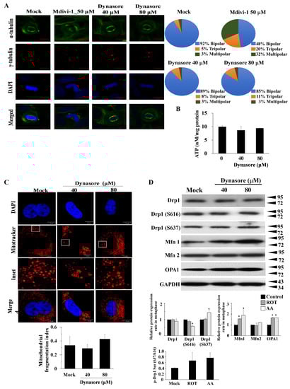 Dynasore did not significantly affect the mitotic defects. (A) HeLa cells were synchronized at G2/M by nocodazole, followed by incubation for 24 h in drug-free medium in the absence (control) or presence of Dynasore. More than 300 cells were calculated. Quantitation pie charts indicate the percentage of bipolar, tripolar, and multipolar mitotic cells. (B) Normalized ATP measurements in HeLa cells. (C) Mitochondrial morphological features in the presence of Dynasore were evaluated by the changes in mitochondrial dynamics. (D) HeLa cells were synchronized by double nocodazole block, released into fresh medium at the indicated time points, and then analyzed by immunoblotting with antibodies against the indicated proteins. GAPDH was used as an internal control. The bar graph represents the mean of triplicates ± SD. * p < 0.05 compared with the Mock group.