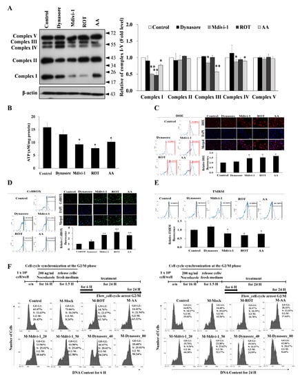 Mitochondrial function was assessed in ROT, AA, Mdivi-1, and Dynasore treated and untreated cells by measuring oxidative stress, ΔΨm and ATP. As Figure 4B shows, significantly reduced levels of ATP production were found in HeLa cells treated with ROT, AA, and Mdivi-1 relative to untreated HeLa cells. In contrast, ATP production was unchanged in Dynasore-treated HeLa cells. ΔΨm was a bit different from ATP production. While ROT, AA, Mdivi-1, and Dynasore significantly increased ROS overproduction in HeLa cells, ROT, AA, and Mdivi-1 increased both ROS and superoxide in HeLa cells, while Dynasore only slightly increased ROS (Figure 4C,D). ΔΨm fluorescence was significantly increased in HeLa cells treated with ROT, AA, and Mdivi-1, but Dynasore-treated cells showed no change in ΔΨm fluorescence (Figure 4E). In this study, through detailed characterization of the effect of ROT, AA, Mdivi-1, and Dynasore on cell cycle progression, we found that ROT, AA and Mdivi-1 induced a time-dependent accumulation of G2/M phase cells in the HeLa strain. Importantly, under treatment conditions that cause significant M-phase arrest in HeLa cells (ROT, AA and Mdivi-1 for 16 to 24 h), Dynasore did not induce M-phase arrest in HeLa cells. In control cells nocodazole (200 nM) induced a characteristic G2/M-pattern cell cycle and also did not show M phase accumulation after extended exposure for up to 24 h (Figure 4F). These results suggest that ROT, AA, and Mdivi-1 induce M-phase arrest in a tumor-specific manner and multipolar spindles formation is affected by mitochondrial complexes I, III, and IV.