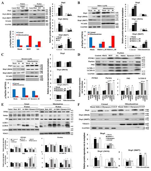 Blockade of mitochondrial ETC results in phosphorylation of mito-Drp1 Ser-637, which is essential for the PINK1/Parkin pathway to regulate mitophagy. (A) ROT or AA decreased Drp1-dependent mitochondrial fission. (B) Mdivi-1 decreased Drp1-dependent mitochondrial fission. (C) Dynasore is not a specific Drp1 inhibitor. Levels of total Drp1, Drp1-Ser616, and Drp1-Ser637 were checked in cytoplasmic and mitochondrial fractions in M phase with ROT, AA, Mdivi-1, and Dynasore for 24 h. (D) ROT, AA, and Mdivi-1 treatments can upregulate expression of Parkin and promote mitophagy in M-phase arrest. (E) Levels of PINK1/Parkin, P62, and LC3B were checked in cytoplasmic and mitochondrial fractions in M phase with ROT, AA, Mdivi-1, and Dynasore. (F) CCCP decreased Drp1-dependent mitochondrial fission. VDAC1 was assessed as an internal loading control. GAPDH was checked for subcellular purity. The bar graph represents the mean of triplicates ± SD. * p < 0.05, ** p < 0.01, *** p < 0.001 compared with the control group and Mock group.