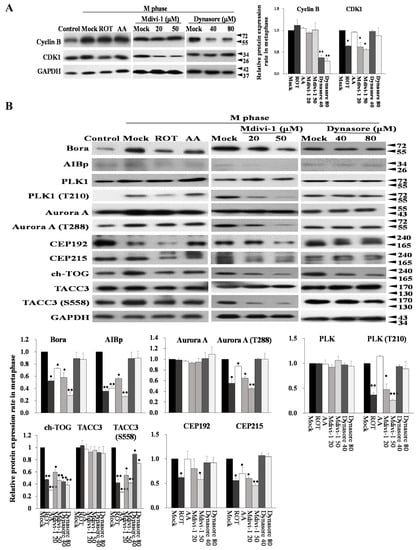 In this study, we provided evidence that Drp1 plays an essential role in the phosphorylation of Ser637, but not Ser616, to regulate mitophagy by inducing multipolar spindles in M phase. Markers for mitotic dysregulation, such as the aberrant protein expression of AIBp, Bora, Aurora A and Plk1, multipolar spindles and mitochondrial elongation, were observed in ROT, AA, and Mdivi-1 treated cells compared to Mock cells. Understanding this process will help delineate the relationship between maintenance of mitochondrial respiration and centrosomal abnormalities inducing spindles defects. A decrease in cell growth is associated with dysfunction in mitochondrial respiration. The blockade of electron transfer led to electron leaking. Of note, ETC complex IV blockade possibly caused reduced ATP synthesis [6,31]. In previous studies, Pallavi Srivastava and Panda demonstrated that the mitochondrial complex I inhibitor ROT inhibits microtubule assembly by attaching to the microtubules. The accumulation of BubR1 (an essential protein for spindles assembly checkpoint signaling) in the mitotic cells indicated that kinetochores were not properly attached to the microtubules [17,32]. In this study, we determined that mitochondrial dysfunction induces multipolar spindles formation by increased oxidative stress (Figure 1 and Figure 2). However, Dynasore had only a slight effect on mitotic defects and did not affect mitochondrial morphology (Figure 3).