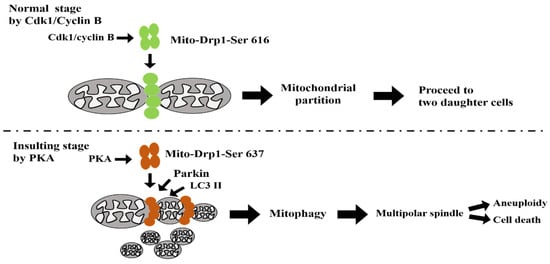 In this study, we demonstrated that ETC inhibitors or Mdivi1 drive mitophagy to induce multipolar spindles formation. We also found that the phosphorylation status of Ser637, but not Ser616, in Drp1via PKA converges with regulatory mitotic kinases Cdk1, Plk1, Aurora A, and associated proteins like Cyclin B, Bora, AIBp, CEP192/CEP215, and TACC3/chTOG to induce multipolar spindles formation in the mitotic phase (M-phase). This is the first study to reveal that the status of Drp1 phosphorylation at Ser637 in mitochondria by protein kinase A (PKA) (herein designated mito-Drp1-Ser637) plays a vital role in mitochondrial fission via the PINK1/Parkin pathway to drive mitophagy and, via mitotic kinases, induces multipolar spindles formation in the M phase.