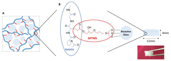 (A) Schematic representation (inspired from Mahony et al. [18]) and (B) chemical structure of the hybrid made of gelatin and bioactive glass (BAG) covalently linked by 3-glycidoxypropyltrimethoxysilane (GPTMS).