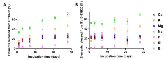 For both hybrids, the Si and Na releases are more important than for the other elements, with a Na release already stable from the first time point for G*/13-93B20. The higher concentrations of Si and Na are probably because they come not only from the glass but also from the GPTMS and NaF, respectively. The important release of Si in solution is probably followed by condensation and polymerization, forming an amorphous silica-rich layer around the glass [28], slowing down the release of Ca, Mg, K, and B (for G*/13-93).